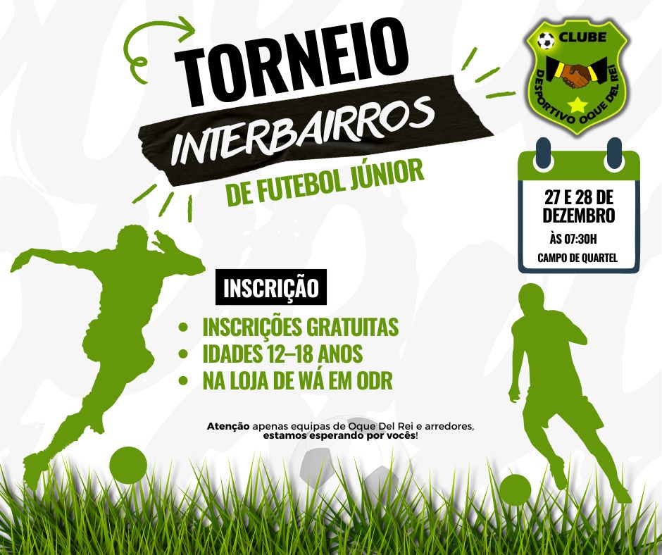 O Clube Desportivo Oque Del Rei convida os jovens craques da comunidade para o grande Torneio Interbairros de Futebol Júnior! O evento será realizado nos dias 27 e 28 de dezembro, a partir das 07:30, no Campo de Quartel. Esta é a oportunidade perfeita para as equipas de Oque Del Rei e arredores mostrarem o seu talento em campo. As inscrições são totalmente gratuitas e estão abertas para jovens com idades compreendidas entre os 12 e os 18 anos. Os interessados devem garantir o seu lugar até ao dia 25 de dezembro, dirigindo-se à Loja de Wá em Oque Del Rei. Reúna a sua equipa, prepare as chuteiras e venha fazer história neste campeonato que celebra o desporto e a união entre os bairros.