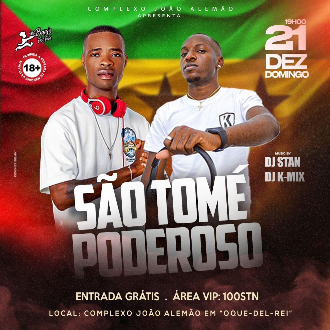 O Complexo João Alemão apresenta o evento "São Tomé Poderoso" no próximo domingo, dia 21 de dezembro. Com início marcado para as 19h00, a noite será comandada pelos ritmos de DJ Stan e DJ K-Mix. A entrada é gratuita para o público geral, com uma área VIP disponível por apenas 100 STN. Evento exclusivo para maiores de 18 anos.