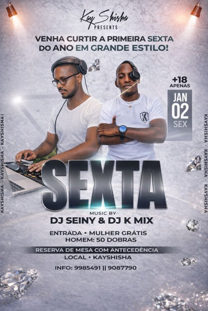 Venha celebrar a primeira sexta-feira do ano no Kav Shisha. O evento conta com a animação musical dos DJs Seiny e K Mix. A entrada é gratuita para mulheres e tem o custo de 50,00 Dobras para homens. É possível efetuar reserva de mesa com antecedência através dos contactos fornecidos. Evento para maiores de 18 anos.