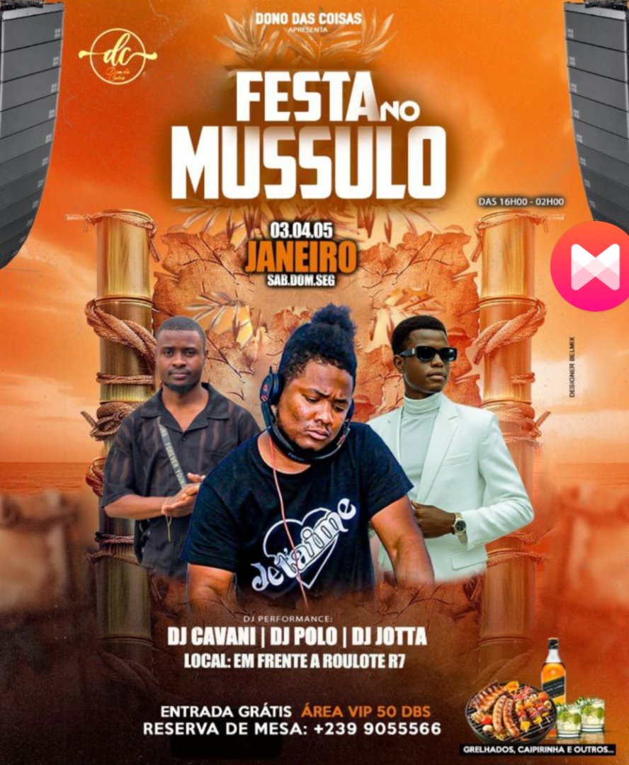 O evento "Festa no Mussulo" continua com uma programação especial de três dias (Sábado, Domingo e Segunda-feira). A animação musical será garantida pelos DJs Cavani, Polo e Jotta. A entrada é gratuita para o público geral, com uma Área VIP disponível por 50 Dobras. O recinto dispõe de serviços de restauração com grelhados e bebidas variadas como caipirinhas.