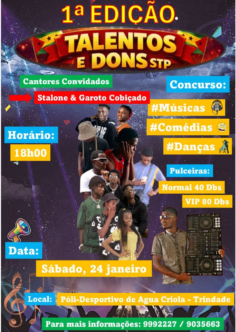 Prepare-se para uma noite de grande entretenimento com a primeira edição do concurso Talentos e Dons STP! O evento terá lugar no sábado, dia 24 de janeiro de 2026, a partir das 18h00, no Poli-desportivo de Água Crioula, em Trindade. Será uma competição vibrante abrangendo as categorias de música, comédia e dança, revelando o que de melhor se faz na nossa cultura. A noite contará ainda com a presença especial dos cantores Stallone e Garoto Cubiçado, além da animação musical garantida pelo DJ Jeik Silva. As pulseiras estão à venda no local da atividade por 40 DBS (Normal) e 80 DBS (VIP). Venha apoiar os novos talentos nesta celebração imperdível de arte e dons!