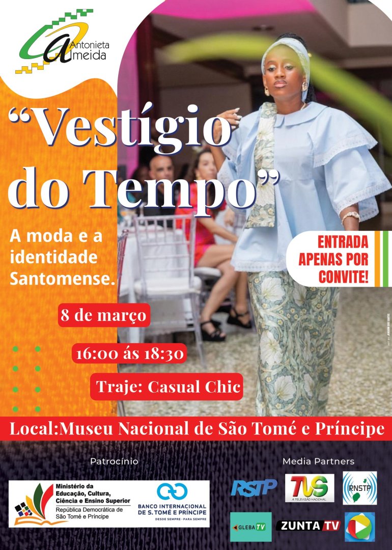 No dia 8 de março, em comemoração ao Dia Internacional da Mulher, a estilista são-tomense Antonieta Almeida promove um evento cultural exclusivo com o tema "Vestígios do Tempo: A Moda e a Identidade São-tomense". O evento terá lugar no Museu Nacional de São Tomé e Príncipe, das 16h00 às 18h30, reunindo convidados para uma experiência que explora a moda como um reflexo da história e da identidade cultural do país. Além da apresentação das criações da estilista, o evento proporcionará um momento de intercâmbio cultural, finalizando com um cocktail especial para os convidados. O evento conta com o patrocínio do BISTP e o apoio do Ministério da Educação, Cultura, Ciência e Ensino Superior.