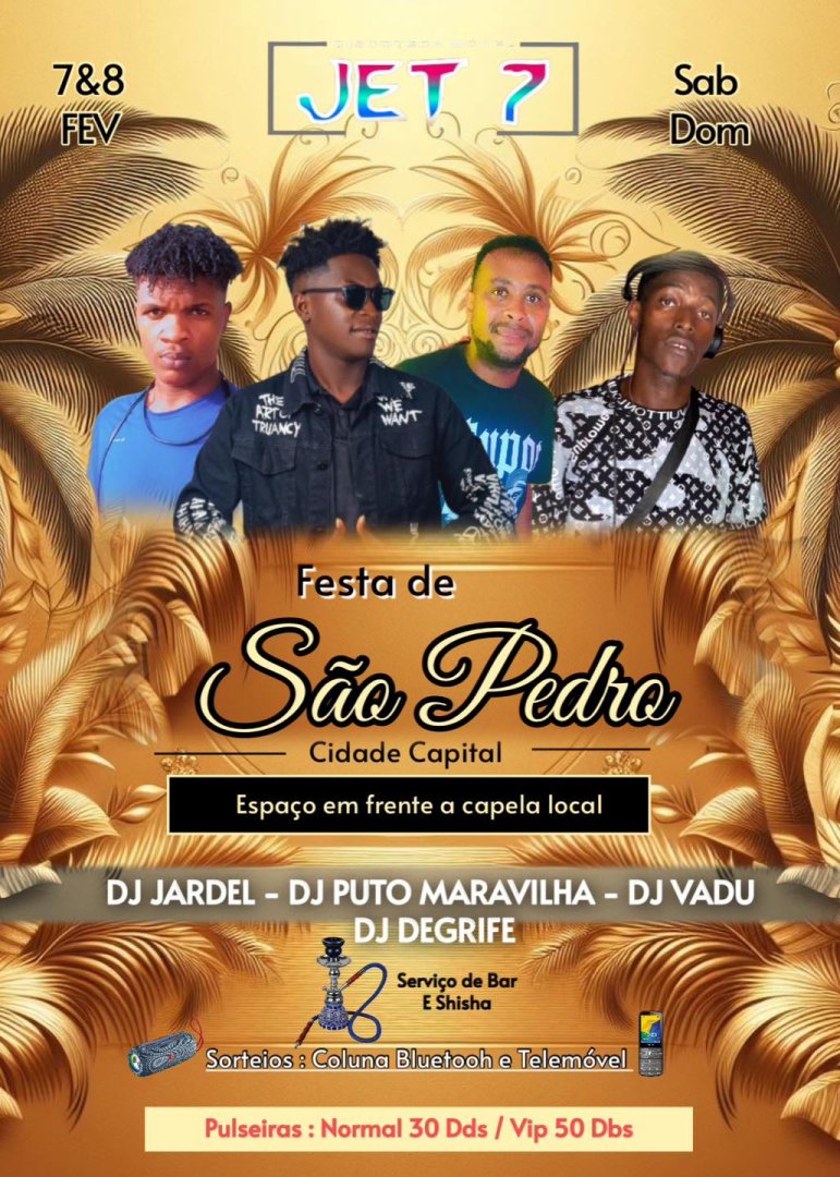 🔥 FESTA DE SÃO PEDRO – CIDADE CAPITAL A vibe que vai PARAR a cidade está a chegar! 💃🏽🕺🏽 📅 7 & 8 de Fevereiro (Sáb & Dom) 📍 Espaço em frente à capela local 🎧 No comando do som: 🔥 DJ Jardel 🔥 DJ Puto Maravilha 🔥 DJ Vadu 🔥 DJ Degrife 🍹 Bar & Shisha disponíveis 🎁 SORTEIOS: Coluna Bluetooth 📢 + Telemóvel 📱 🎟️ Pulseiras: 👉 Normal: 30 Dbs 👉 VIP: 50 Dbs 🚨 👉 Não fiques de fora! Chama os amigos e vem celebrar o São Pedro como nunca antes!