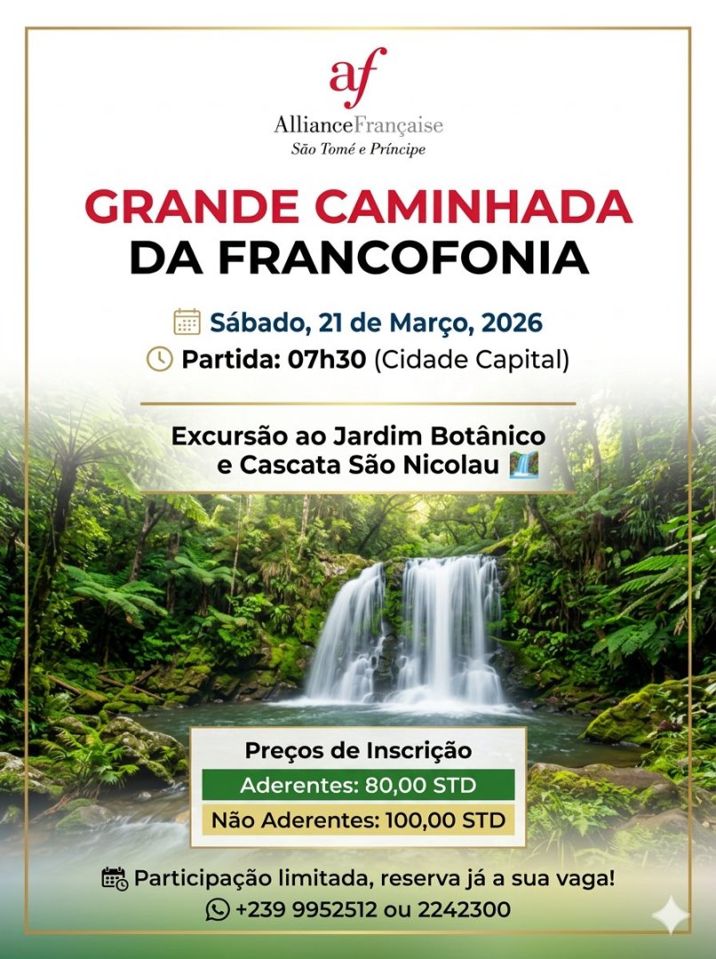 [FRANCOPHONIA] Caminhada Francófona – 21 de março Junte-se a nós para uma caminhada convivial no Jardim Botânico e na Cascata de São Nicolau! No programa: descoberta das plantas utilizadas na cozinha e na medicina tradicional santomense, enquanto praticamos francês. Uma forma divertida, desportiva e na natureza de falar francês juntos! 🥾🌿 Venham muitos! Vagas limitadas. 📌 Inscrições na AFSTP 🇫🇷 [FRANCOPHONIE] Randonnée francophone – 21 mars Rejoignez-nous pour une randonnée conviviale au Jardin botanique et à la cascade de São Nicolau ! Au programme : découverte des plantes utilisées dans la cuisine et la médecine traditionnelle santoméenne, tout en pratiquant le français. Une manière ludique, sportive et naturelle de parler français ensemble ! 🥾🌿 Venez nombreux ! Places limitées! 📌 Inscription à l'AFSTP